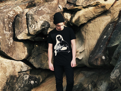 Black short sleeve shirt with one color print.